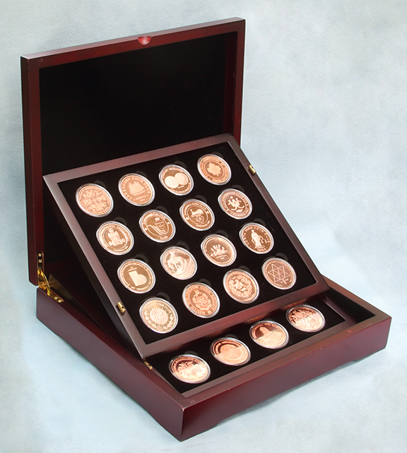 Each of the participating clubs have chosen the specific mintages, metals and pricing structure for themselves. The clubs agreed that the RCNA could assemble complete sets of the medals, struck in copper, which they would make available at the Association's Annual Convention held on July 18–23, 2017 at Boucherville QC. The set includes a beautiful wooden box with two trays; some of the medals in this set are only available in the set. Some of the participating clubs have chosen to issue a very limited mintage in .9999 fine silver. If you are interested in ordering medals directly from the club, a list of the contact information is available on the RCNA Web site at: www.rcna.ca/societies.php.